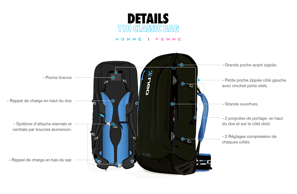 Haut et étroit, le CLASSIC 110 L permet de plier les voiles à jonc en 3, et intègre parfaitement les cocons peu volumineux mais longs comme le NEO Suspender. Notre nouveau sac 110L revient avec une version encore plus confort grâce à son système de prise en charge.