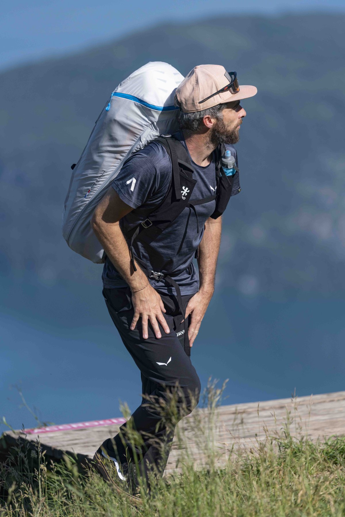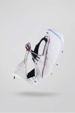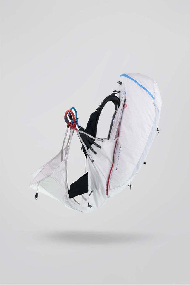 Le renfort dorsal et les bretelles sont les mêmes en position vol et marche. Cette technique permet de sauver du poids et du volume de portage et rend l’ensemble plus simple d’utilisation.