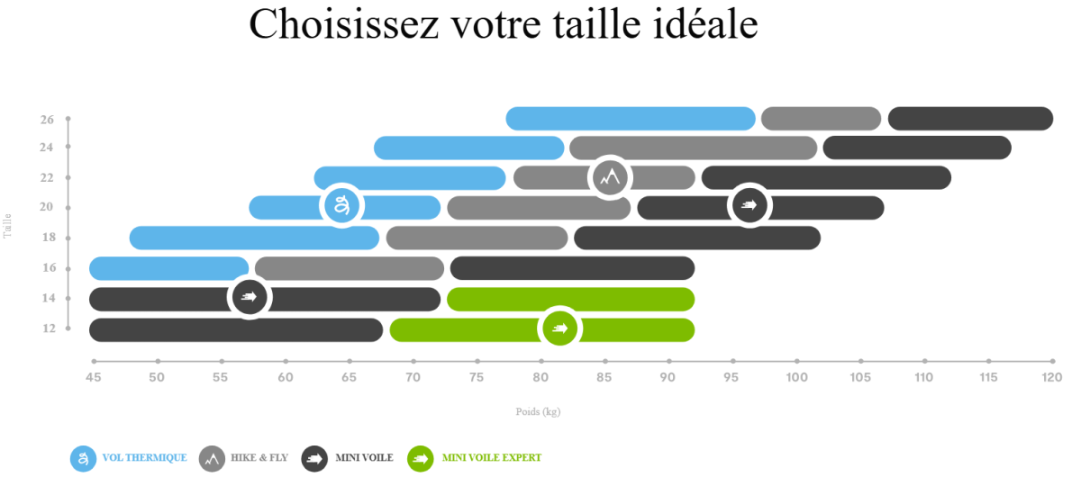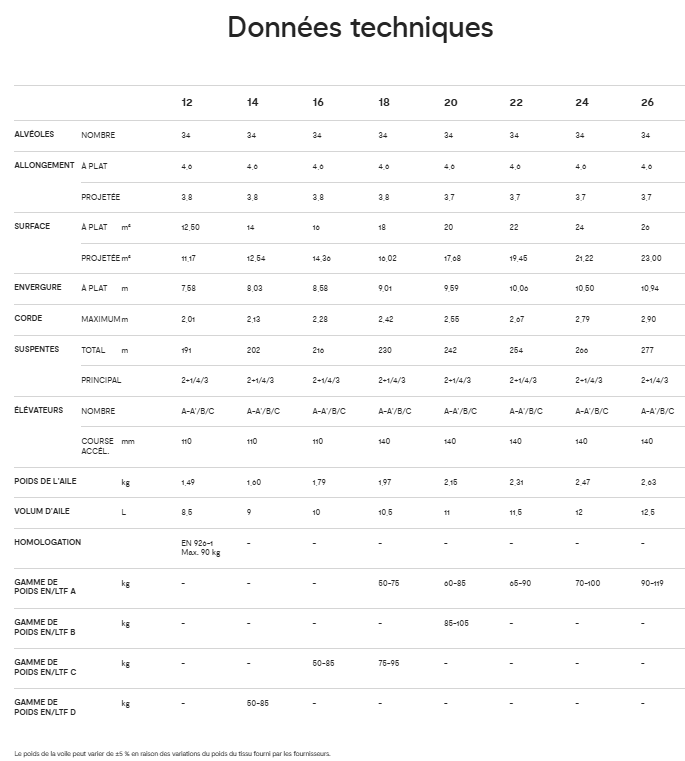 Les petites tailles 12-14, ainsi que les tailles intermédiaires 16-18 lorsqu’elles sont volées près de leur charge alaire maximale, sont conçues pour des pilotes expérimentés, maîtrisant le pilotage actif. Le comportement de l’aile varie selon le poids, devenant bien plus réactif et dynamique lorsque la voile est chargée.