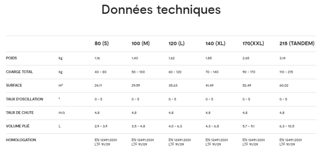 Disponible en six tailles : 80 (S), 100 (M), 120 (L), 140 (XL), 170 (XXL) et 215 (biplace).